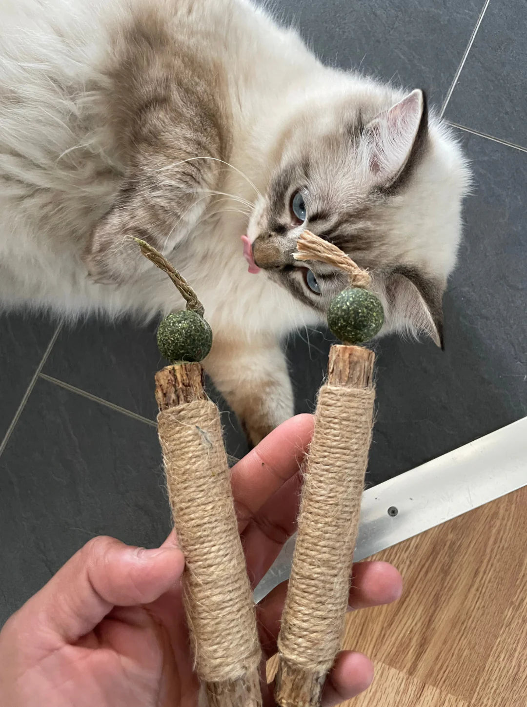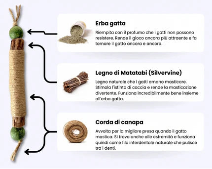 verified Doppia pallina di erba gatta: a ciascuna estremità è presente erba gatta di alta qualità che rende il gatto particolarmente giocoso e desideroso di masticare.
